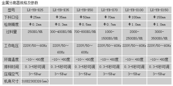 原料從料斗或送料器自由下落進入金屬分離器,如果沒有金屬雜質(zhì),原料會直接通過金屬分離器流向下端的出料口。如果檢測器檢測到原料中含有金屬,那么控制器立刻啟動分離板將金屬物和部分原料一起導(dǎo)向側(cè)面的排料口,然后分流板迅速恢復(fù)至正常的位置,分流板速度可調(diào),金屬分離器的檢測精度也可根據(jù)生產(chǎn)需要調(diào)節(jié),最小可檢測并分離出Φ 0.2mm的金屬顆粒。