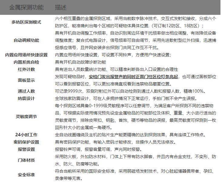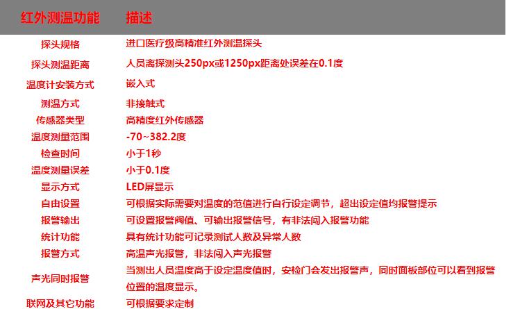 遠距離高精度人體測溫安檢門,集帶人體溫度檢測和金屬探測為一體的安全檢測門,門頭裝有高精度的體溫檢測探頭,探測角度可以上下移動, 能夠測量人體額頭的表面溫度,然后根據(jù)人體額頭的溫度與體溫的關系得到人體的實際體溫。檢測儀的光學組件將額頭發(fā)射和反射的能量匯集到傳感器上,通過電子組件將此信息轉化成溫度讀數(shù)并顯示在顯示面板上,當溫度讀數(shù)超過高溫報警值時,儀器會發(fā)出報警聲.報警溫度可隨意設置.具有防水、防火、防腐等特點。適用于管制刀具和槍支等危險品的安全檢查,廣泛應用于適用于機場,車站,出入境檢查站,等人員密集場所。是防止疫情擴散的有效手段。